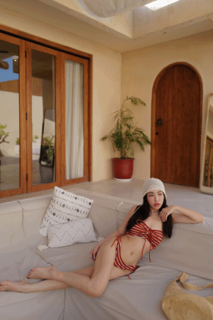 平口綁帶條紋比基尼